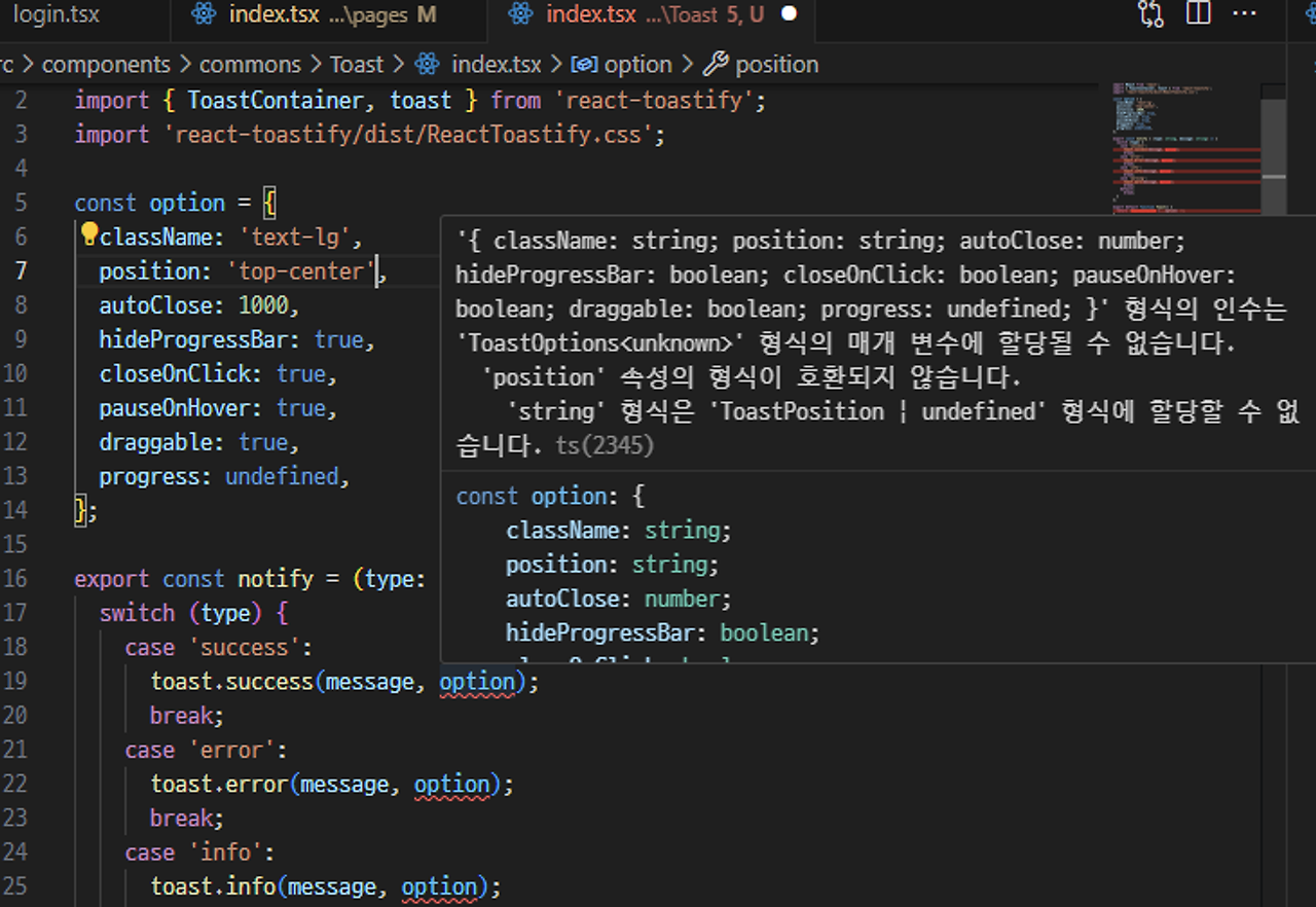 👉 string을 ToastPosition으로 단언(as) 해주면 해결된다.