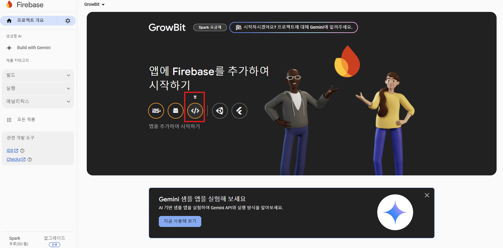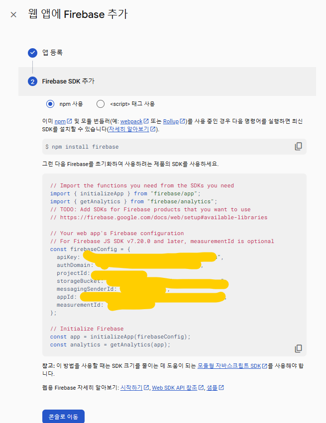 2. 아래 웹을 선택 후 앱 등록을 해주고 Firebase SDK추가를 해준다.