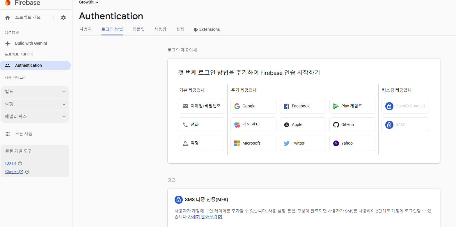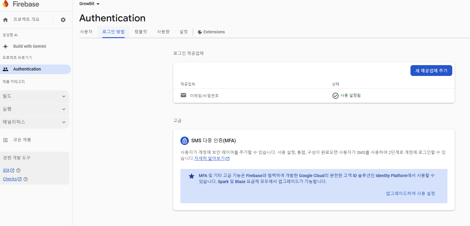 3. Authentication탭에서 이메일/비밀번호로 로그인 방법을 추가한다.