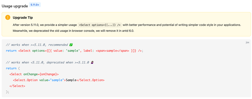 Ant Design의 Select 컴포넌트가 예전에는 아래처럼 자식 컴포넌트를 직접 넣는 ‘컴파운드 스타일’을 썼다.