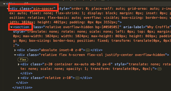 아래 사진을 보면 GSAP이 pin-spacer라는 div를 임의로 만들고,